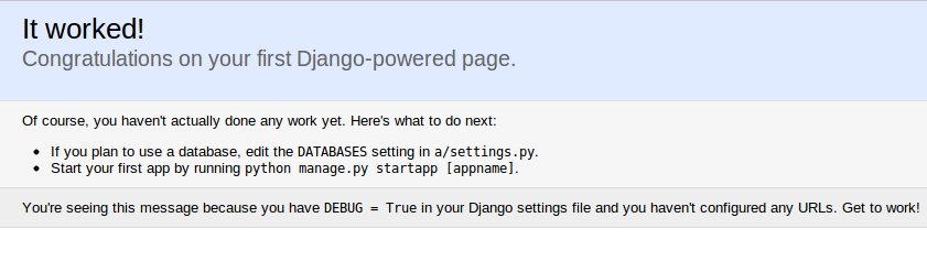 )সাধারণত আপনার urls.py তে অনেকগুলো কমেন্ট থাকবে। ওগুলো মোছার দরকার নেই। ওরা ওদের মত থাক, কেননা আমাদের টিউটোরিয়ালের পরবর্তী অংশে যখন আমরা স্বয়ংক্রিয় অ্যাডমিন ইন্টারফেস ব্যবহার করা শিখবো, তখন ওই কমেন্টগুলোকে সাংঘাতিক রকমের প্রয়োজন হবে! যাই হোক, এইবার আবার আমাদের মূল প্রজেক্টের ফোল্ডারে ফিরে যাই এবং ডেভেলপমেন্ট সার্ভার চালু করি। চালু করে ব্রাউজারে http://localhost:8000 তথা আমাদের ডেভেলপমেন্ট সার্ভারে প্রবেশ করি। অভিনন্দন! আপনি আপনার প্রথম জ্যাঙ্গো অ্যাপ তৈরি করে ফেলেছেন!