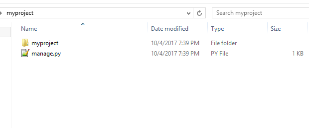 সেটার ভিতরে একটি ফাইল (manage.py) এবং একটি ফোল্ডার (myproject) থাকবে:
