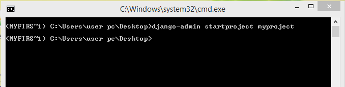 যাইহোক, আমাদের প্রথম প্রজেক্ট আসলে হ্যালো ওয়ার্ল্ড টাইপের ওয়েবসাইট তৈরি করা! অর্থাৎ এমন ওয়েবসাইট যেটাতে ভিজিট করলে আমরা Hello World! লেখাটি দেখতে পাবো! প্রথমে কমান্ড প্রম্পট (টার্মিনাল) ওপেন করুন, ভার্চুয়াল এনভায়র্নমেন্ট একটিভ করুন, কারেন্টওয়ার্কিং ডিরেক্টরি ঠিক করুন যেখানে আপনার প্রজেক্টটি বানাতে চান ( উইন্ডোজের ডেস্কটপে প্রজেক্ট করতে চাইলে cd desktop লিখে ডেস্কটপকে কারেন্ট ওয়ার্কিং ডিরেক্টরি বানিয়ে নিন) এরপর নিচের কমান্ডটি লিখে এন্টার চাপুনঃ Django-admin startproject myproject