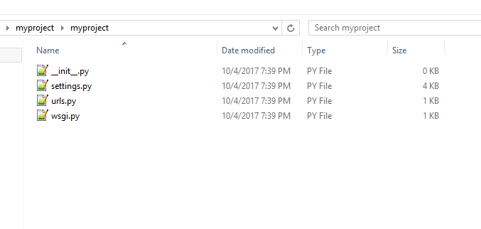 লক্ষ্য করুন, প্রোজেক্টের নামে কিন্তু ফোল্ডার মোট দুইটা, একটার ভিতর আরেকটা! বাইরের ফোল্ডার এর নাম রিনেম করে যা ইচ্ছা দিতে পারবেন সমস্যা নেই! তবে ভিতরের Myproject ফোল্ডারটিই আসলে মূল প্রজেক্ট! এটার নাম চেঞ্জ করবেননা! ভিতরের myproject ফোল্ডারে চারটা পাইথন মডিউল আছে, সেগুলোর সাথে একটু পরিচিত হয়ে নেই!