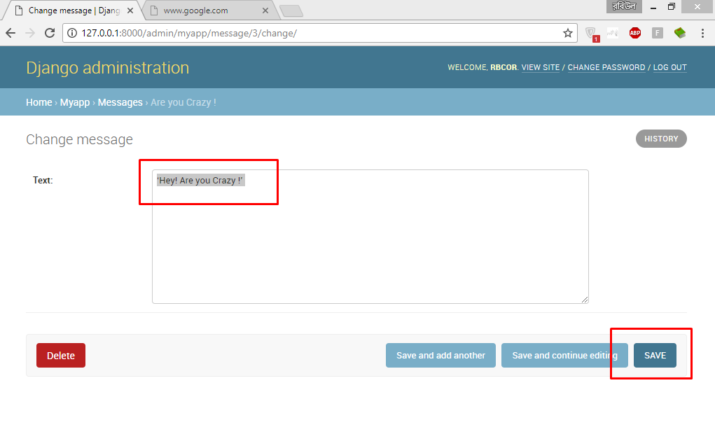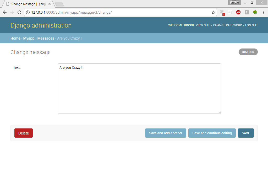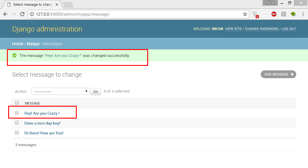 আপনার কাজ হল এডমিন প্যানেলটা আরো ভালো করে ঘুরে দেখা, এই চ্যাপ্টারে আমরা শুধু অবজেক্ট রিড এবং আপডেট করা দেখেছি। আপনি নিজেই চেষ্টা করুন কিভাবে এডমিন প্যানেলের মাধ্যমে নতুন অবজেক্ট/ডাটা (আমাদের এপ এর ক্ষেত্রে ‘মেসেজ’) তৈরি করা যায়! এবং কিভাবে কোন অবজেক্ট/ডাটা ডিলেট করা যায়।