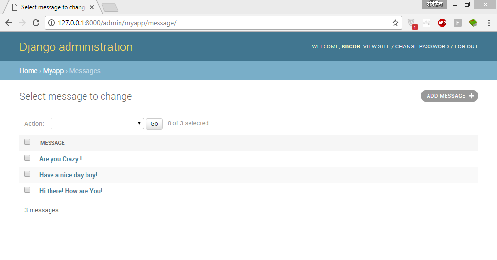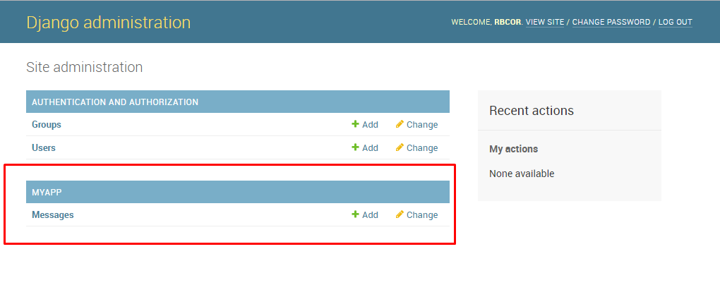 আমাদের এপটি এখন এডমিন প্যানেলে দেখা যাচ্ছে, লক্ষ্য করুন, এপ এর নামটি বড় হাতের অক্ষরে লেখা MYAPP এবং তার নিচে সেই এপ এর Message মডেলটির নাম দেখা যাচ্ছে, তার পাশে Add এবং Change নামে দুটি বাটন দেখা যাচ্ছে!