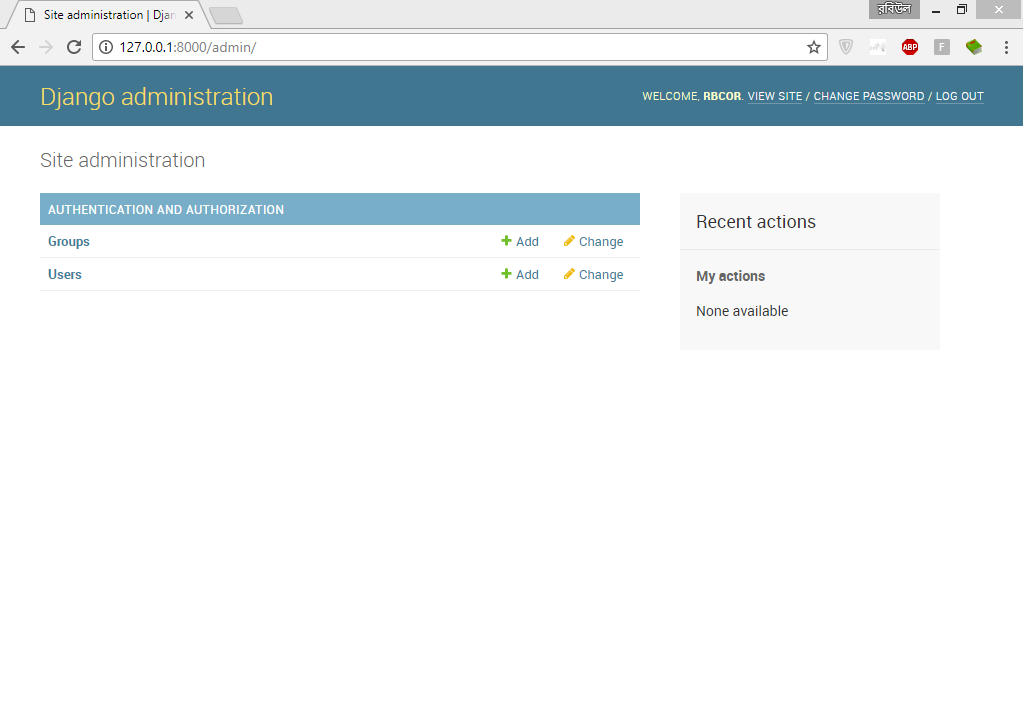 আপাতত সবকিছু বুঝে ফেলার দরকার নেই, পেইজটা ভালো করে দেখুন, উপরের ডান পাশের মেনুটা দেখুন, লগআউট, পাসওয়ার্ড চেঞ্জ, ভিউ সাইট! নাম দেখেই বোঝা যাচ্ছে কোন টা কি কাজের! যেটা বোঝা যাচ্ছেনা সেটা হল মাঝের অংশটা। Site administration লেখার নিচে Grups, Usres লেখাগুলো আসলে ‘মডেল’! মডেল চিনেনতো !? এ দুটি মডেল হল জ্যাঙ্গোর অথেনটিকেশন এবং অথারাইজেশন অ্যাপ এর মডেল।