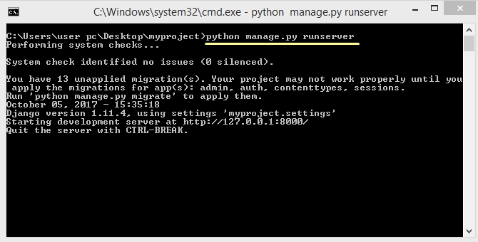 কমান্ড দিয়ে সার্ভার চালু করবেন! আপনার লোকাল সার্ভারের আইপি (ঠিকানা) হবে http://127.0.0.1:8000/ ব্রাউজারের এড্রেসবারে এই ঠিকানা লিখে এন্টার চাপলেই আপনার সাইটের কনটেন্ট দেখতে পাবেন!