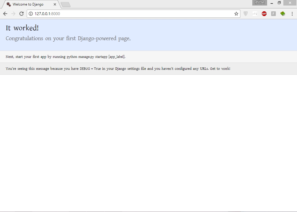 এটাই হল লোকাল ডেভলপমেন্ট সার্ভারের আইপি+পোর্ট! (যখন প্রোজেক্টটি লাইভ সার্ভারে ডেপ্লয় করব তখন এটা কোন রিয়েল ডোমেইন হবে, যেমন http://www.myfirtsdjangoproject.com বা আপনার পছন্দের ডোমেইন! )