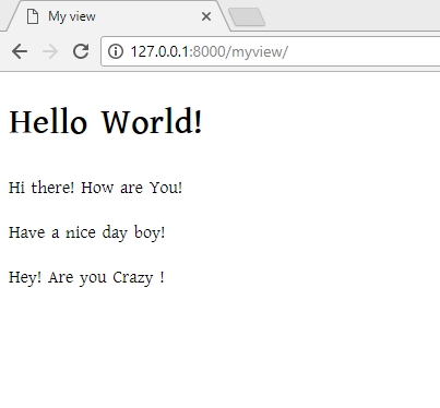 http://127.0.0.1:8000/myview/দেখবেন আমাদের তৈরি করা তিনটি মেসেজ সুন্দর ভাবে শো করছেঃ